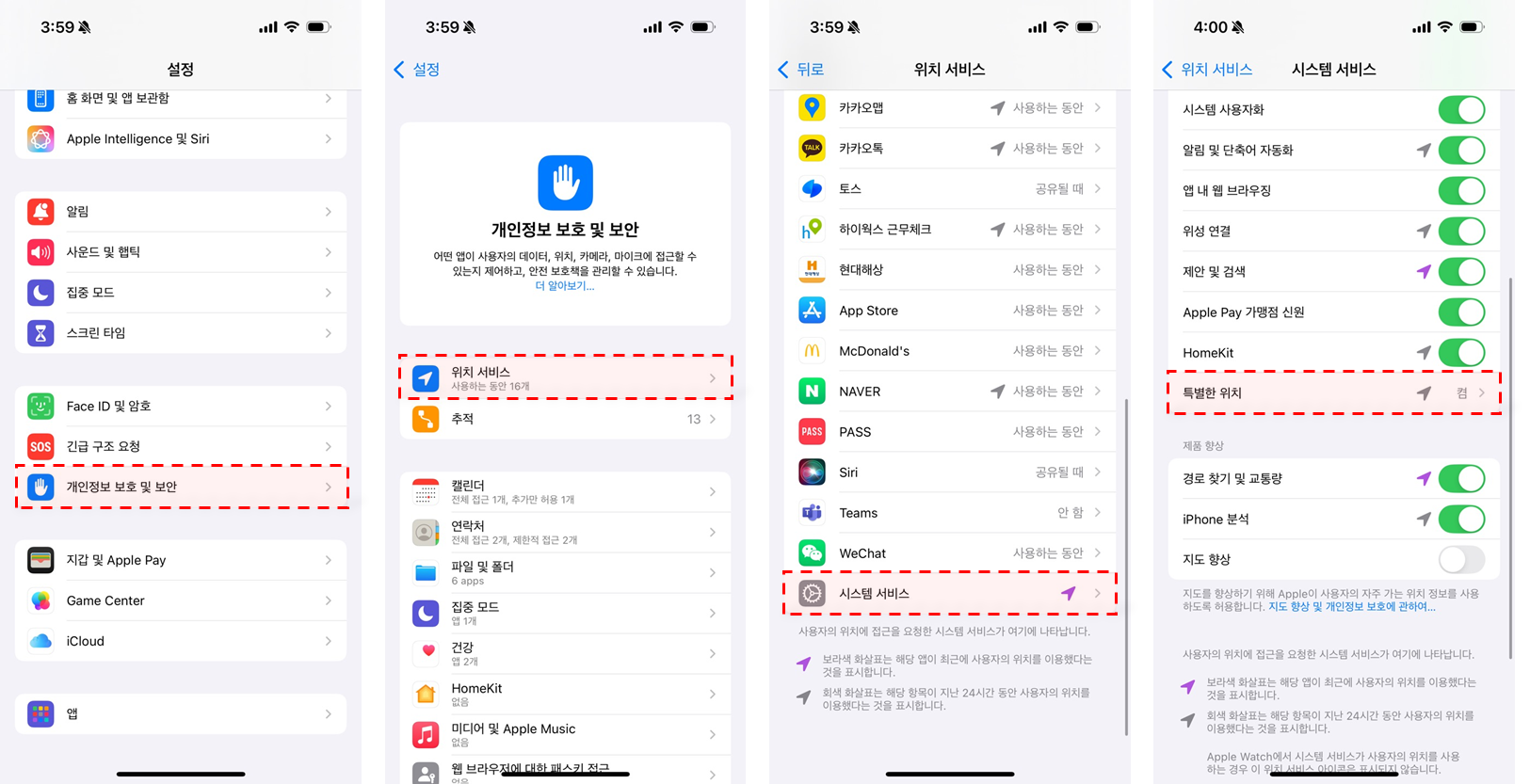 기기 설정 > 개인정보 보호 및 보안 > 위치 서비스 > 시스템 서비스 > 특별한 위치