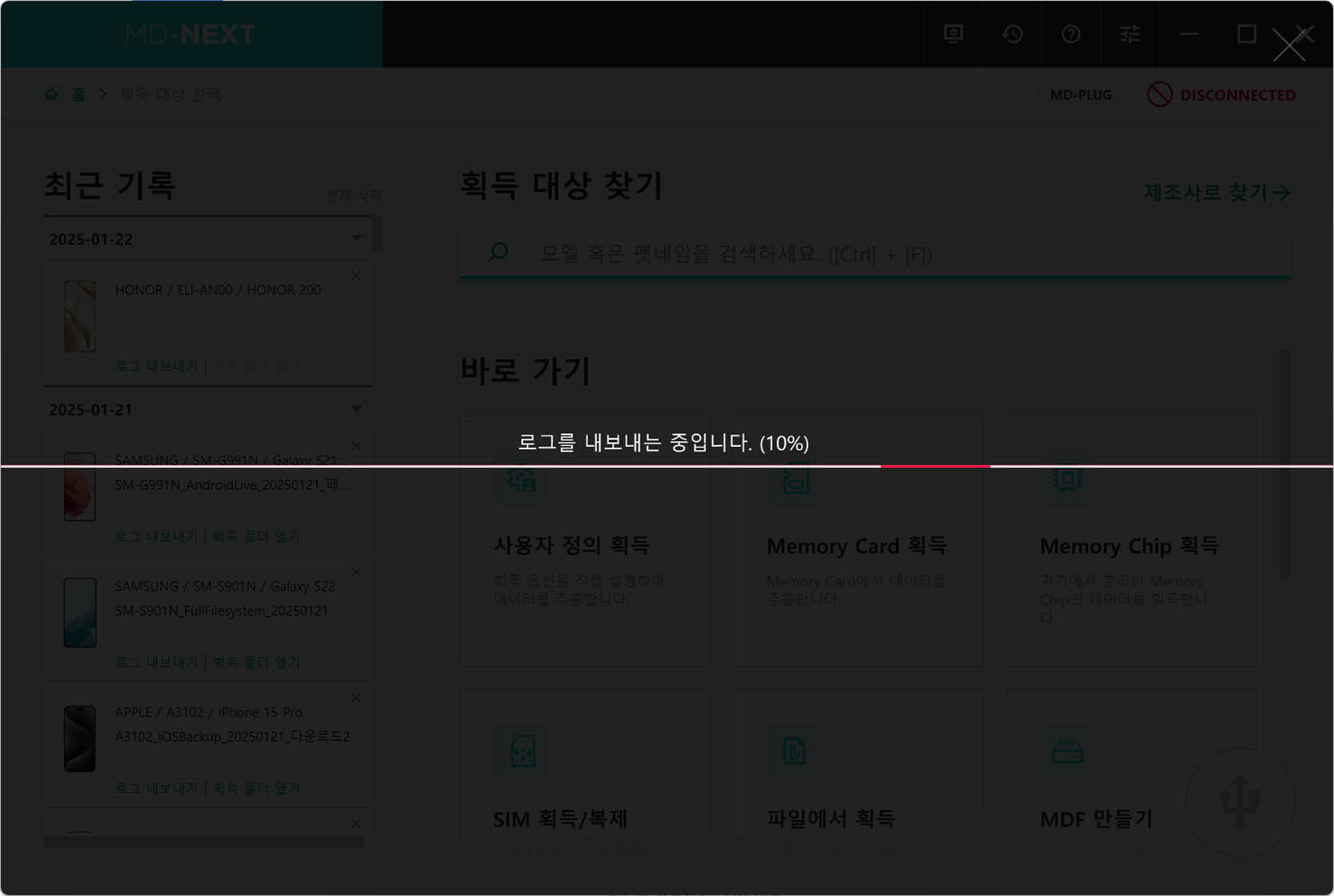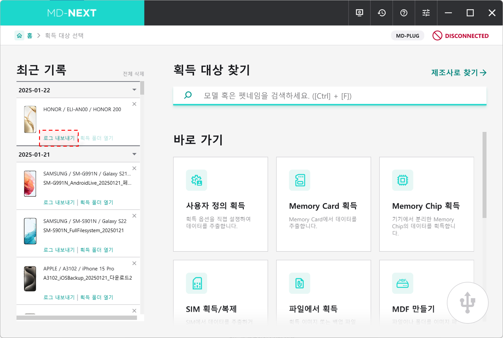 MD-NEXT 홈 화면의 좌측 최근 기록에서 내보내고자 하는 대상의 [로그 내보내기] 버튼을 클릭합니다.