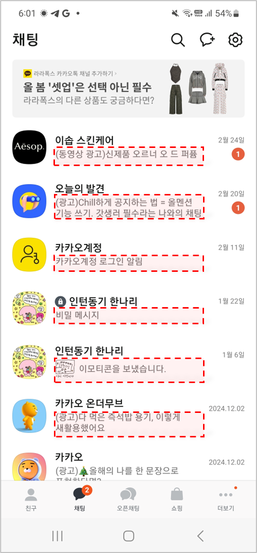 아래 사진과 같이 채팅방 목록에서 채팅방 별 마지막 메시지 내용을 미리 보기로 표시되며, 이 메시지 내용을 분석하는 것이 바로 '마지막 메시지'입니다.