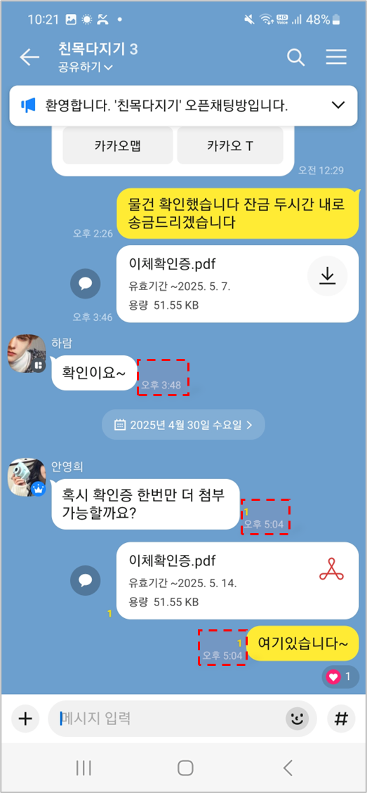 채팅방 진입 시, 메시지 말풍선 옆에 보이는 읽지 않은 사람 수와 동일하며, 메시지별로 분석됩니다.