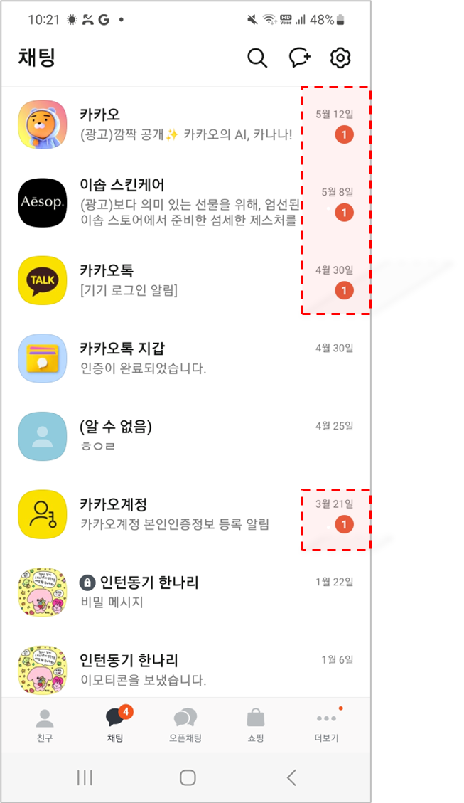 앱 실행 시, 채팅방 목록에서 확인되는 읽지 않은 메시지 수와 동일하며, 채팅방별로 분석됩니다.