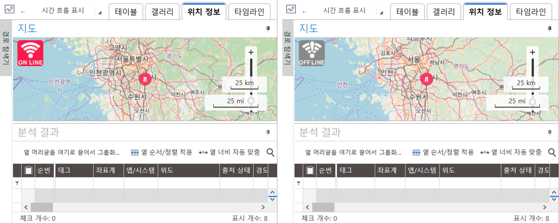 지도 화면 좌측의 와이파이 아이콘을 클릭하여 'OFF LINE' 상태일 때 정상적으로 지도가 표시되는지 확인