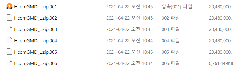 모든 파일을 같은 폴더에 저장한 뒤, HcomGMD_L.zip.001 파일을 압축 해제해 주세요.