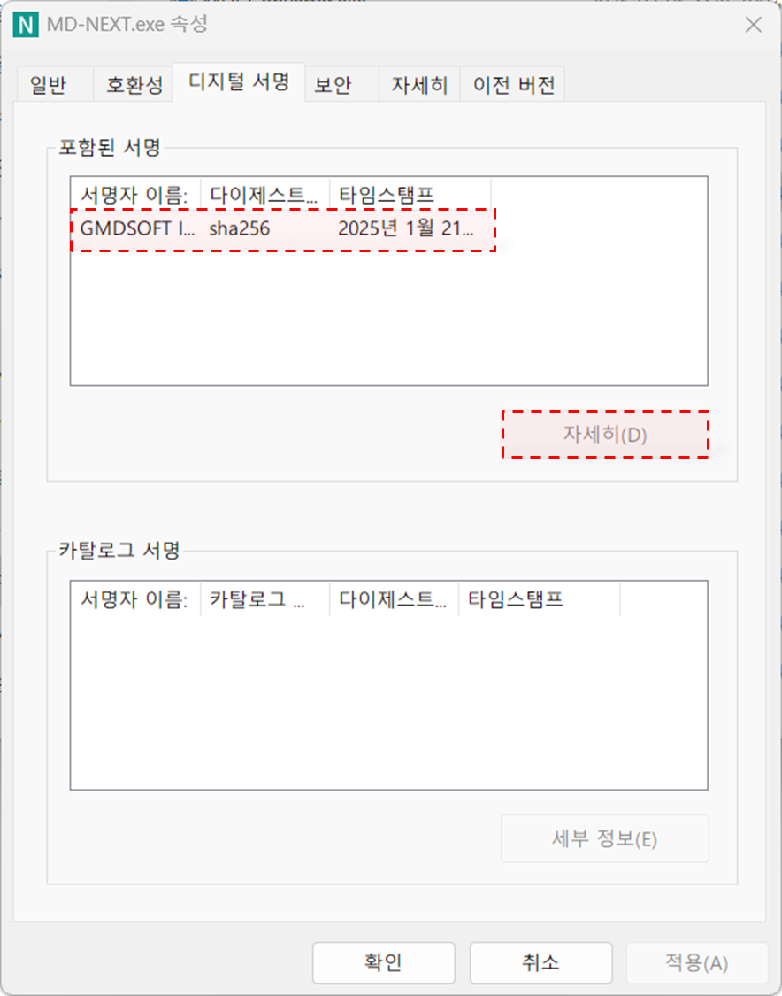 제품 실행 파일(제품명.exe) 우클릭 > 속성 > [디지털 서명]
