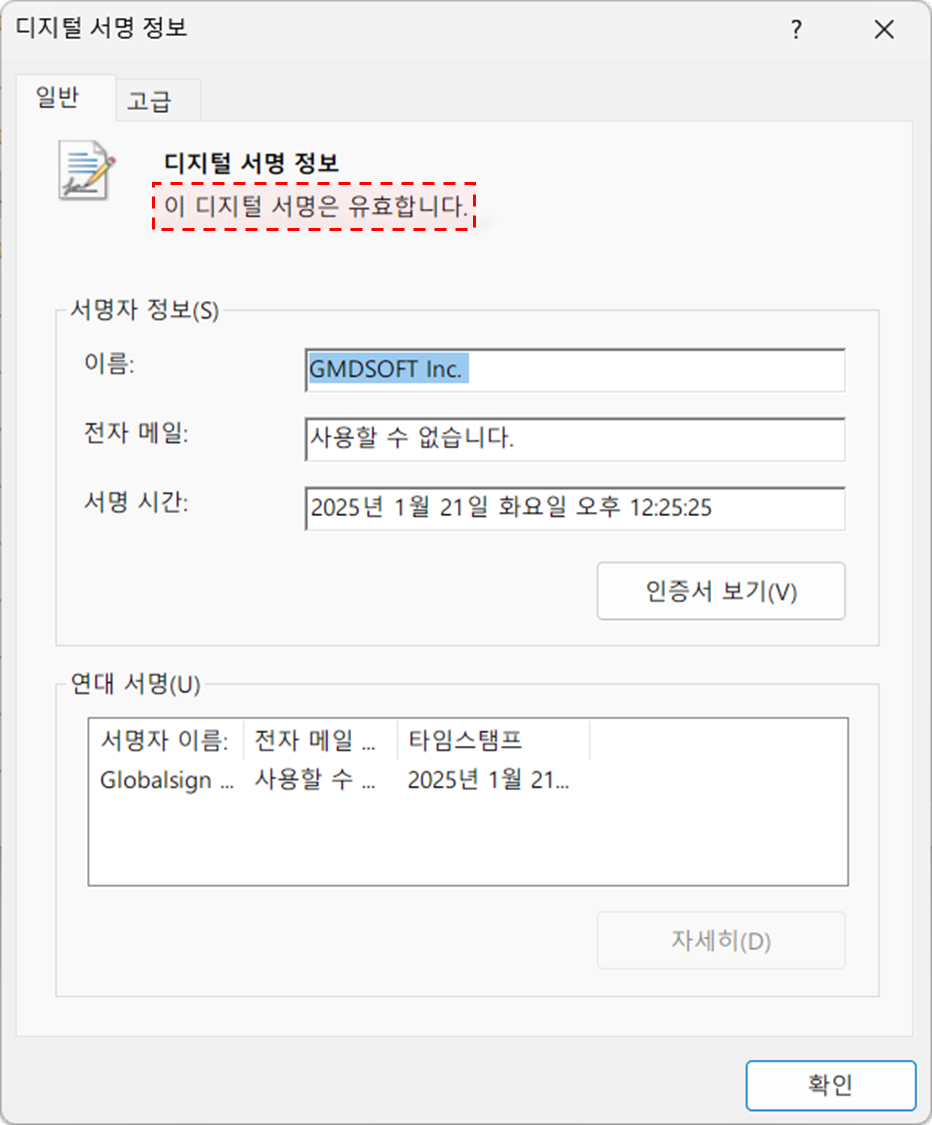위 조치 후 디지털 서명 정보를 확인하여 ‘이 디지털 서명은 유효합니다’ 문구가 확인되면, 제품 설치를 다시 진행합니다.