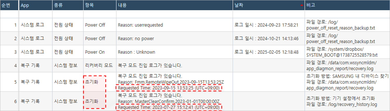 → 로그 내 초기화 시각은 Android 10 이상에서만 저장됩니다. 초기화 시각이 확인되지 않는다면, 파일 시스템의 전체 파일 시각 등을 토대로 시각을 추정해야 합니다.