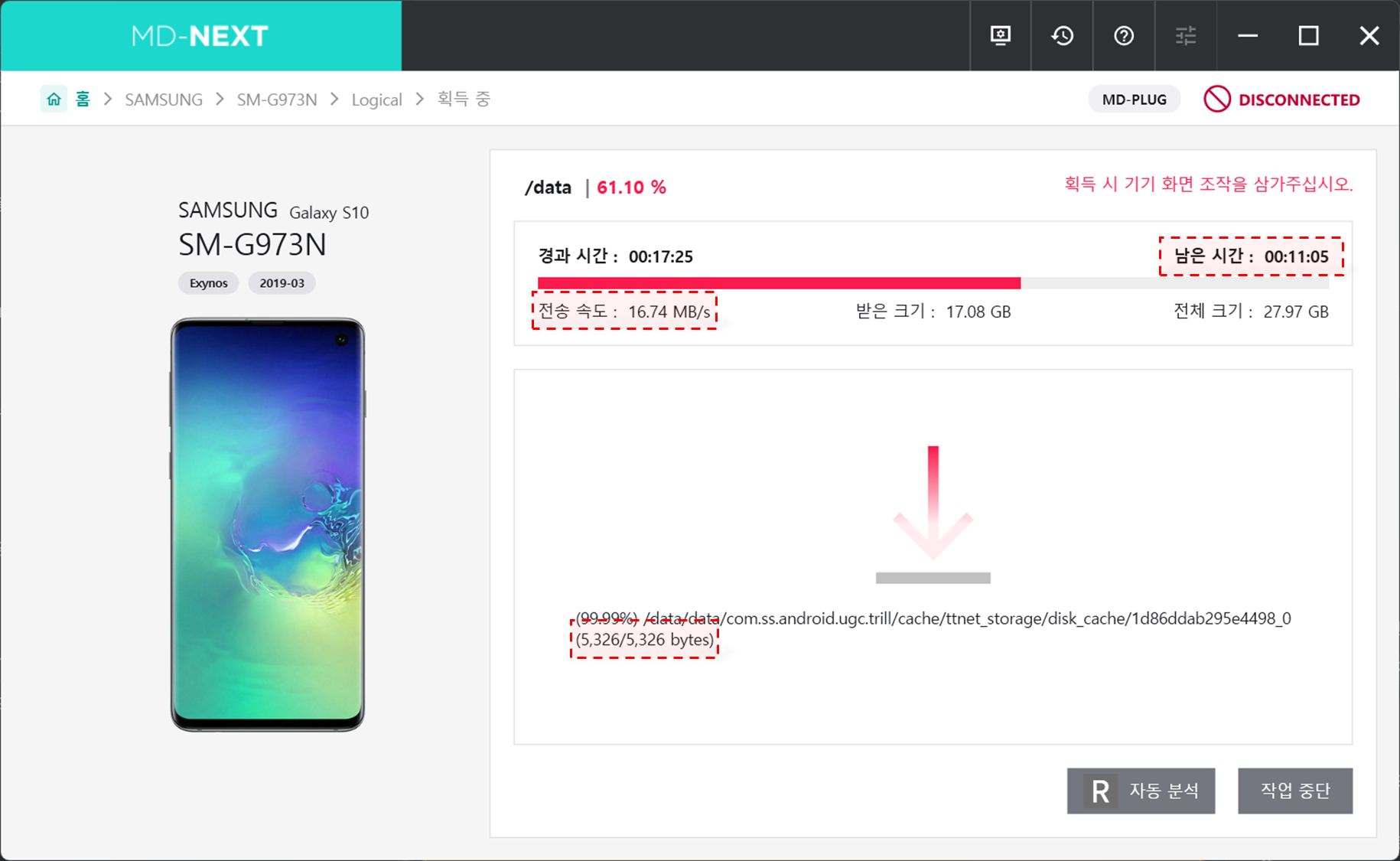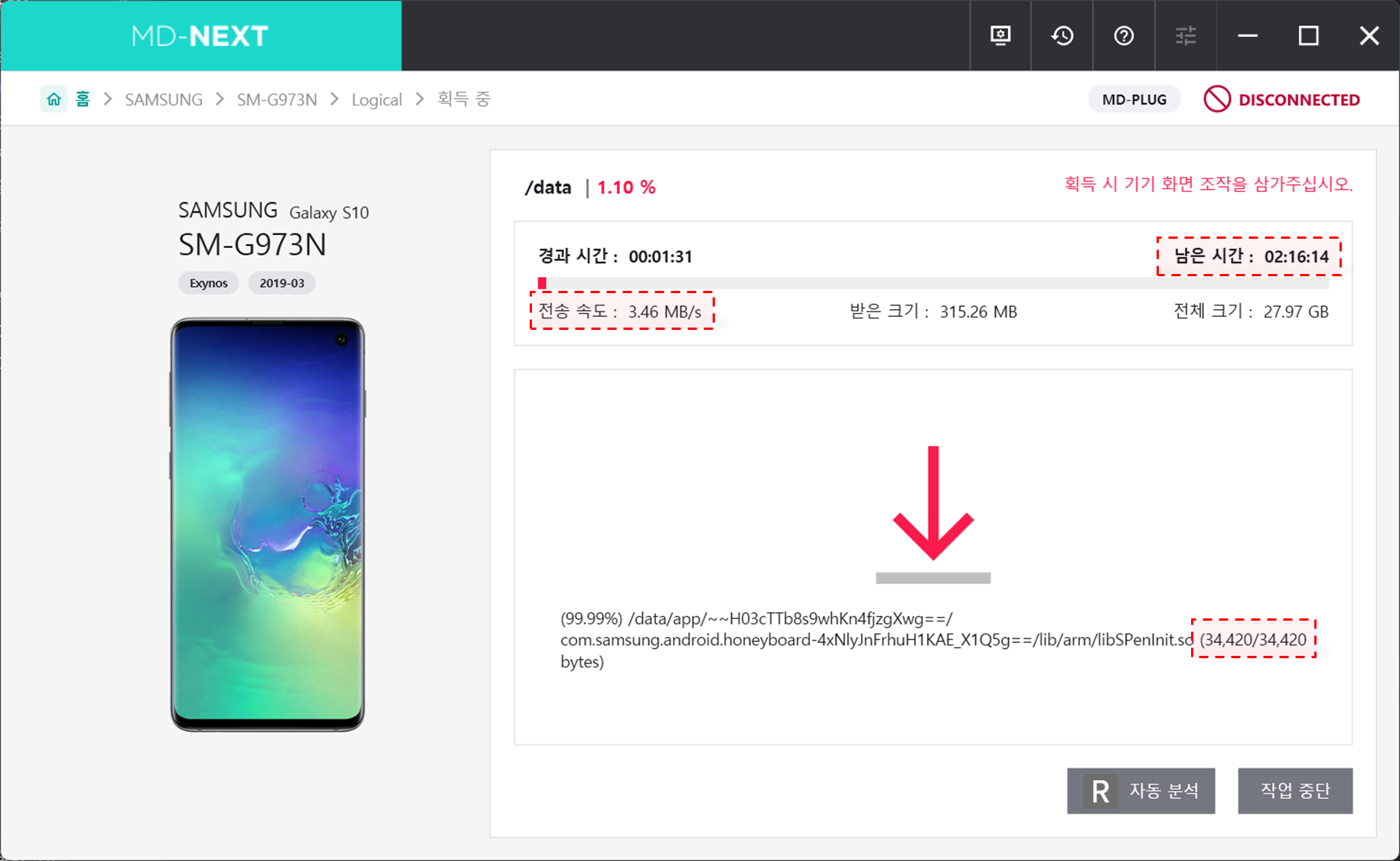 아래는 획득을 진행하며 획득 초반에 작은 사이즈의 파일을 받을 때는 전송 속도가 3.46MB로 표시되나 큰 사이즈의 파일이 획득되면서 16.74MB까지 증가한 것을 확인할 수 있습니다.