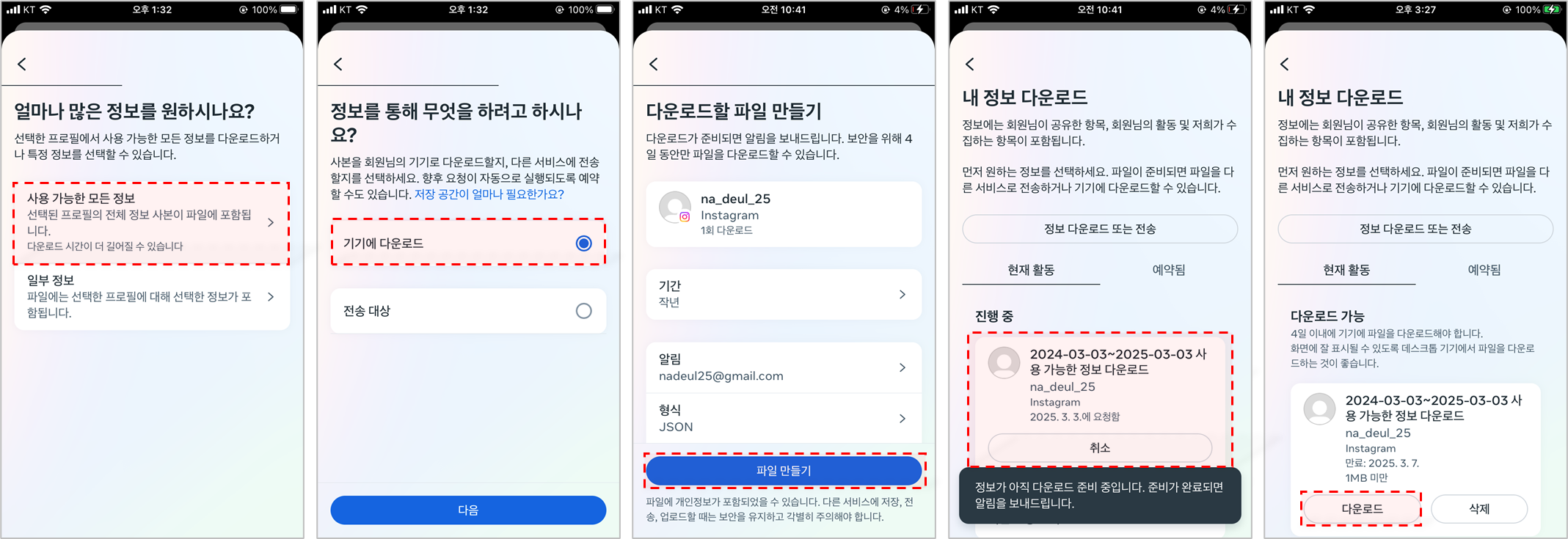 Instagram '내 정보 다운로드' 페이지에서 다운로드를 눌러 기기에 저장할 수 있습니다.