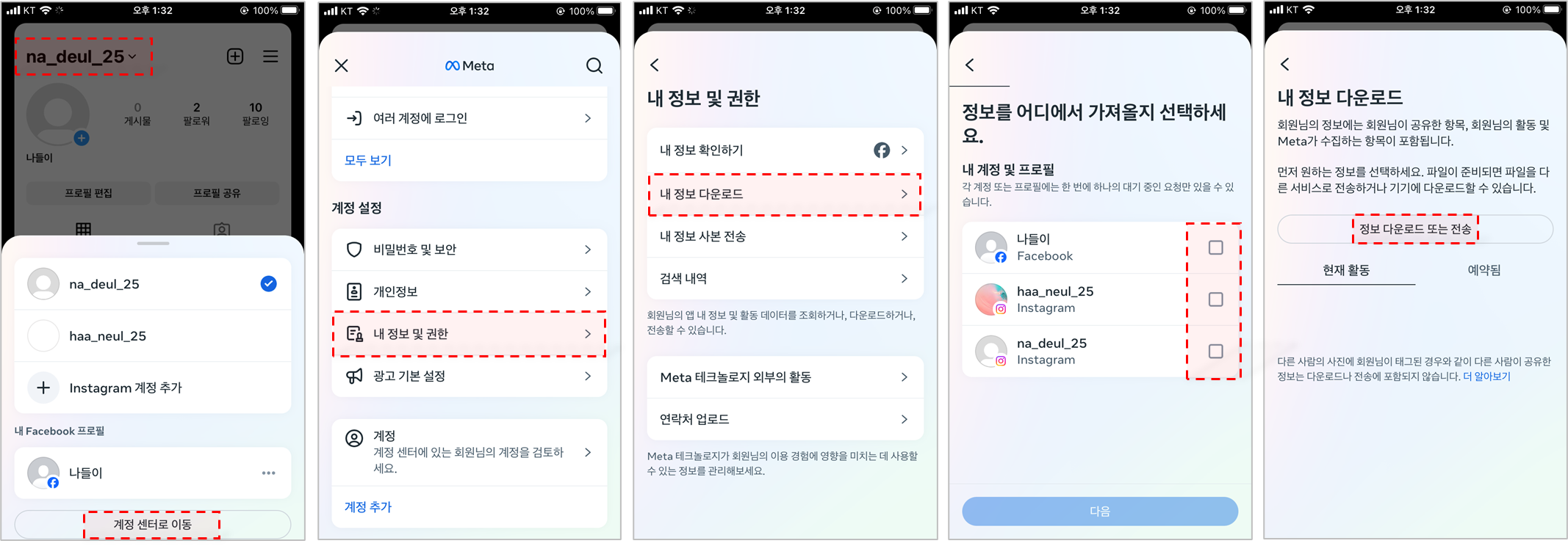 계정 센터로 이동 > 내 정보 및 권한 > 내 정보 다운로드 > 계정 선택 > 정보 다운로드 또는 전송