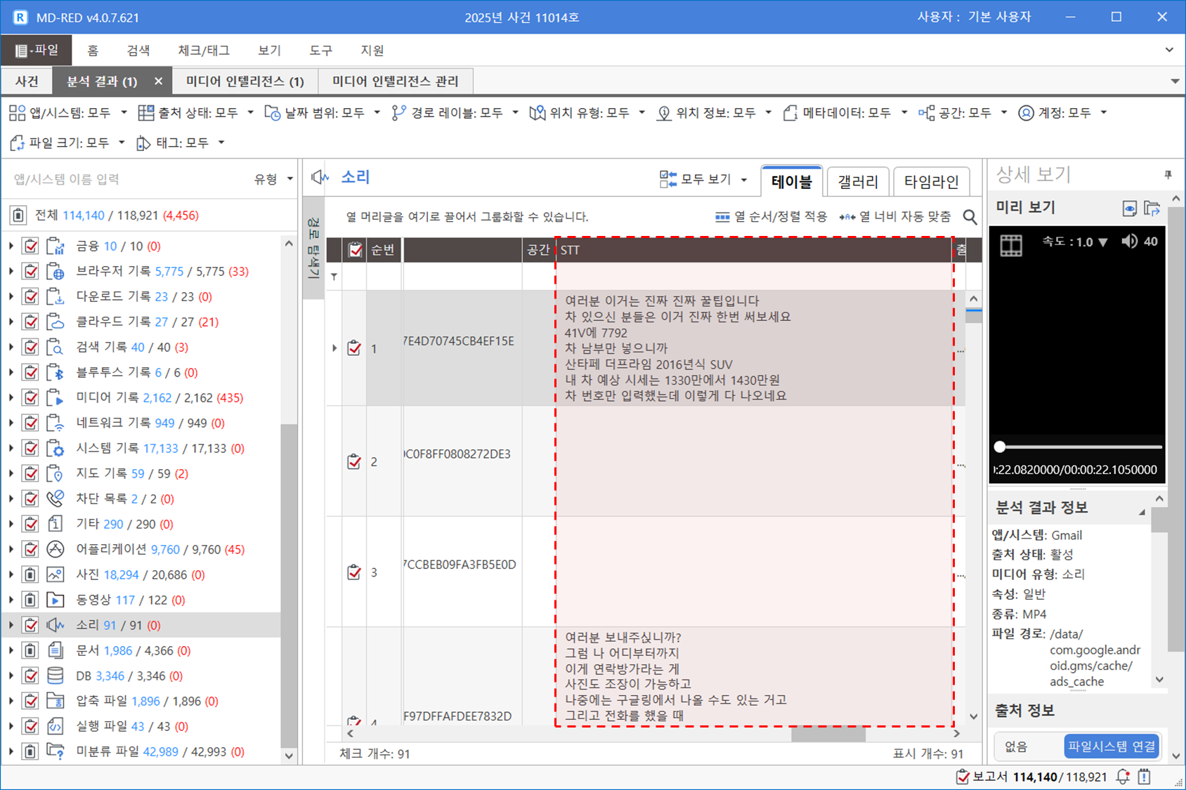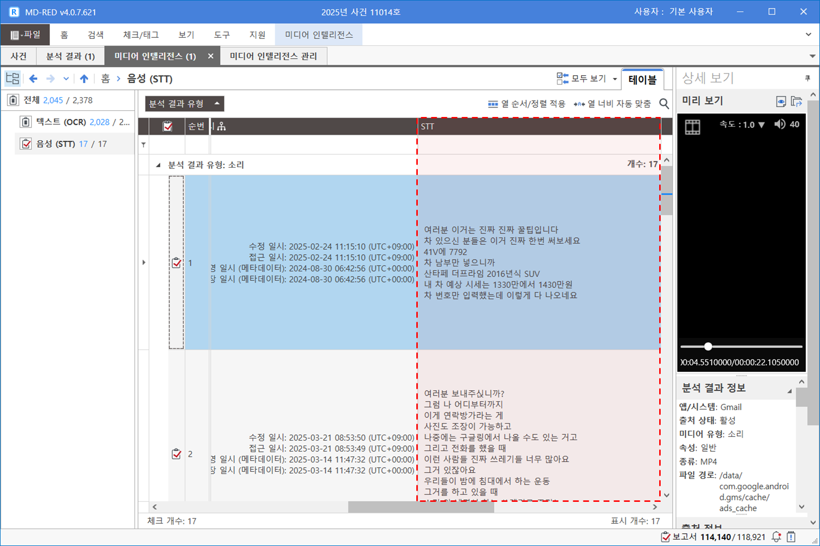 [사진] 분석 결과의 'OCR' 열과 [소리] 분석 결과의 'STT' 열에서 확인하실 수 있습니다.