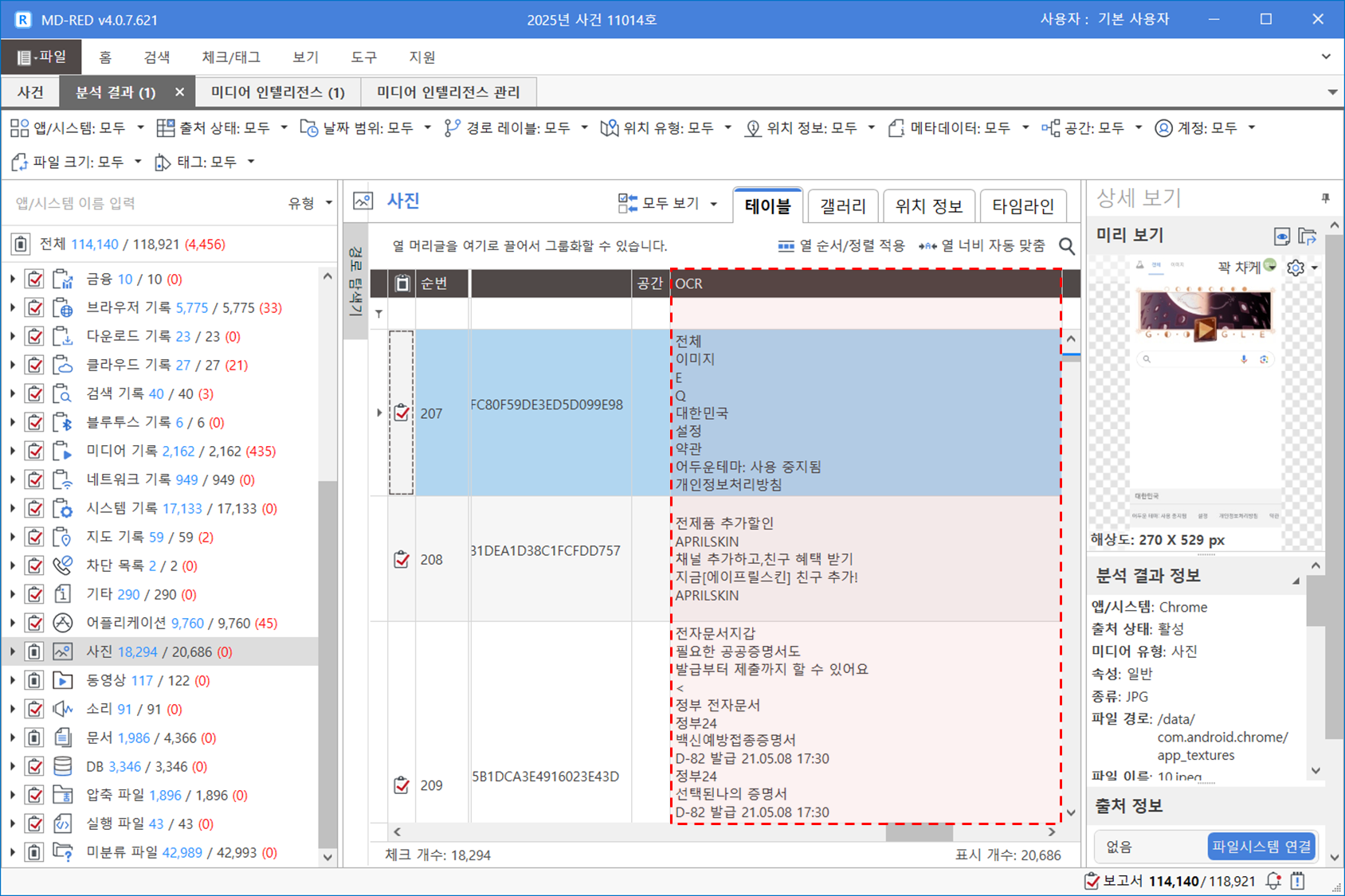 OCR: [사진] 분석 결과 유형의 'OCR' 열 확인