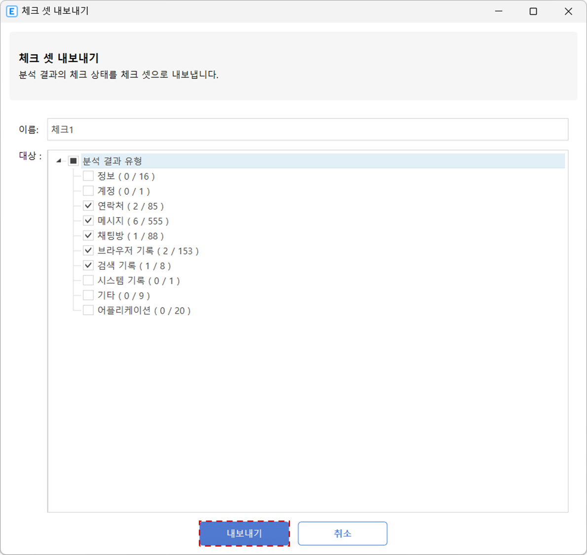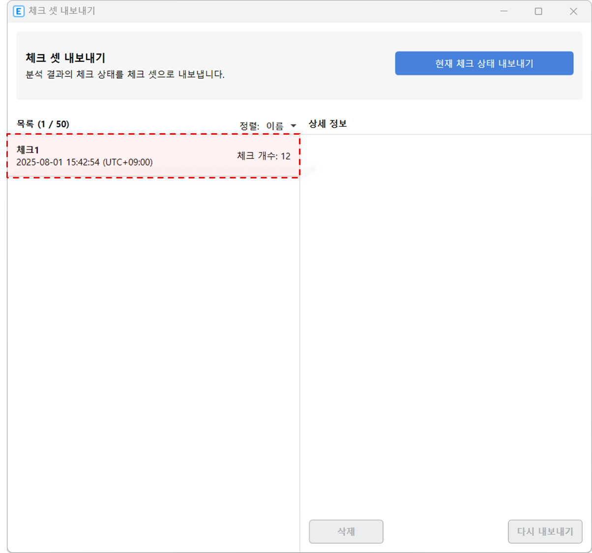 상단 메뉴 '체크/태그' 탭에서 '체크 셋 내보내기'