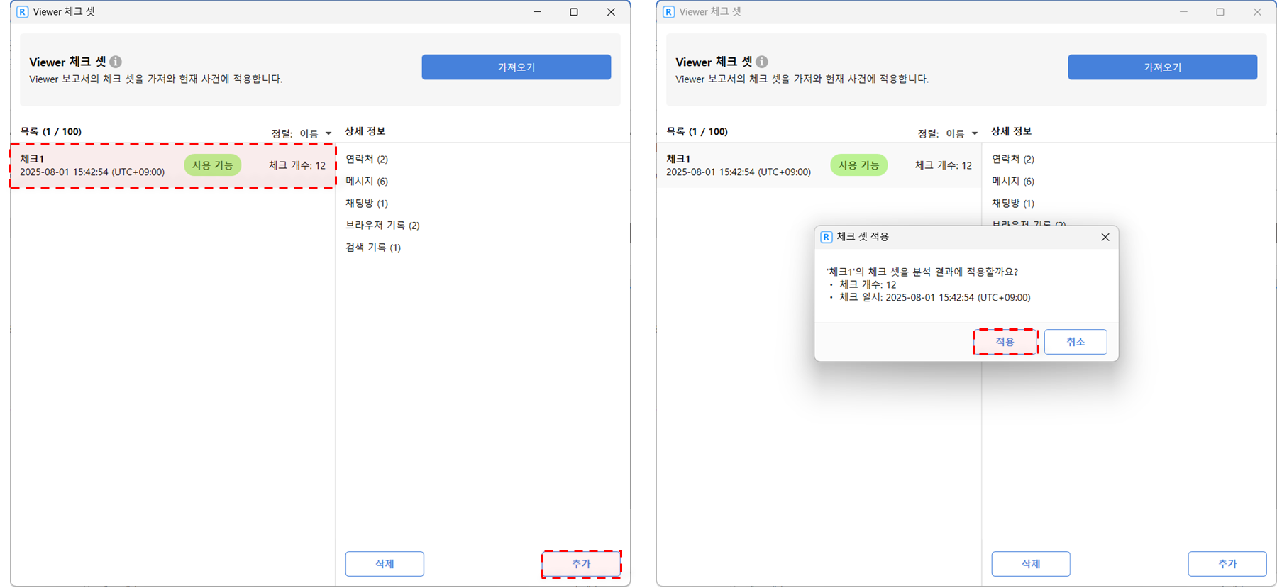 해당 체크 셋 선택 후 '추가' 클릭, 체크 셋 적용