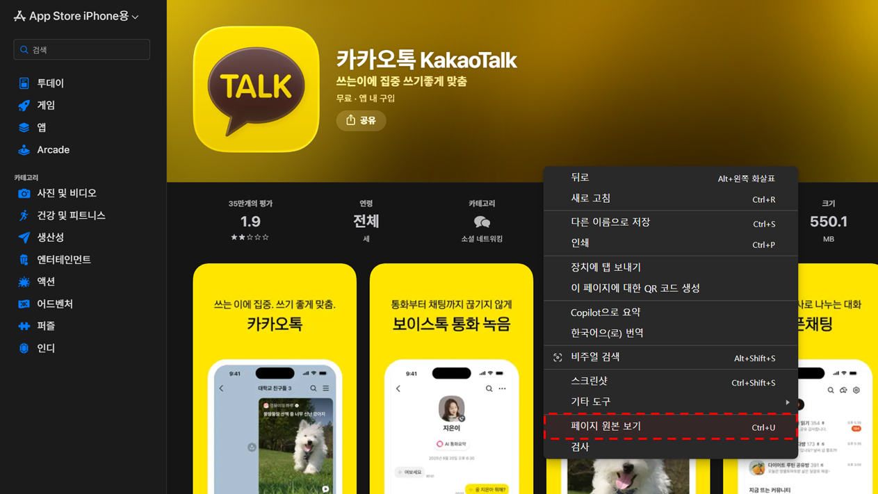 앱 페이지에서 마우스 우클릭 후 ‘페이지 소스 보기’ 선택 (또는 키보드