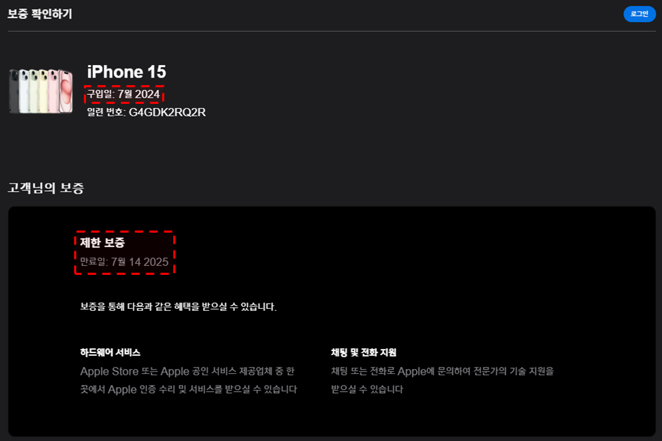 예) 24년 7월 구입일이며, 보증 만료일이 25년 7월 14일이므로, 24년 7월 14일 추정 가능